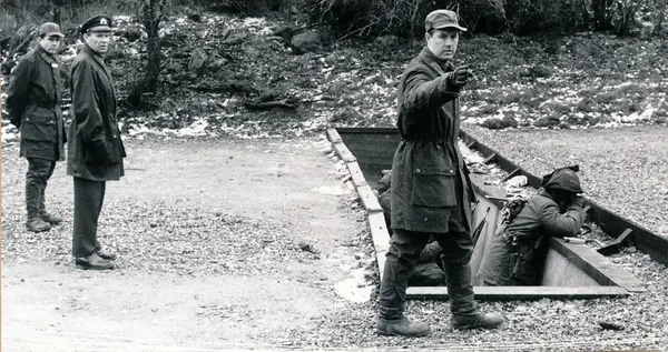 Inspektion av den nytillträdde Militärbefälhavaren för Östra militärområdet, generallöjtnant Nils Sköld den 5 december 1974 Härads skjutfält, frv major Björn von Porat, , MB, major Claes Norberg.
