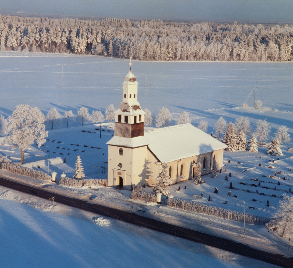 Flygbild Skeda kyrka, 1986.