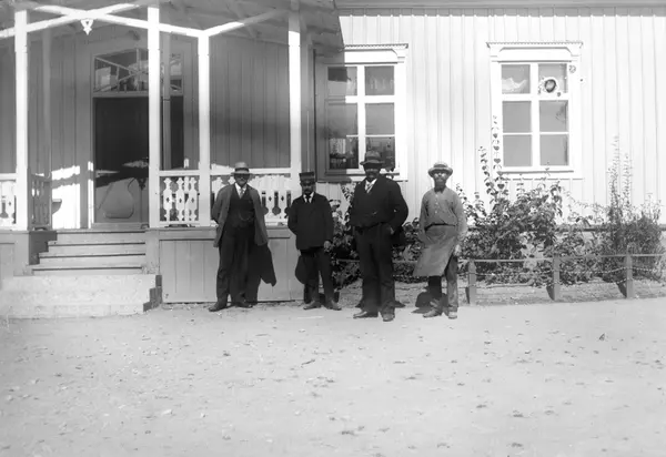 Gruppbild utanför huset Åkersberg. Bilder från Linköping tidigt 1900-tal. Arvid Augustin Eriksson fotograferade i Linköping under åren 1910-1950, han föddes i Linköping 1887-08-27. Arvid arbetade som frisör och drev sin egen frisersalong på Storgatan 13-15. Fritiden ägnade han åt segling och foto och han spelade även dragspel. Med dragspelet underhöll han ibland på fester, vintertid spelade han vid Linköpings skridskobana.
