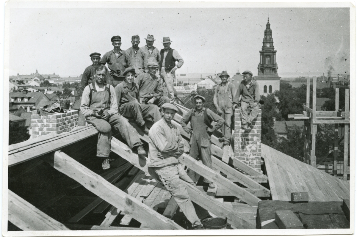 Grupporträtt av arbetarna vid bygget av Tempo-huset, 1935.