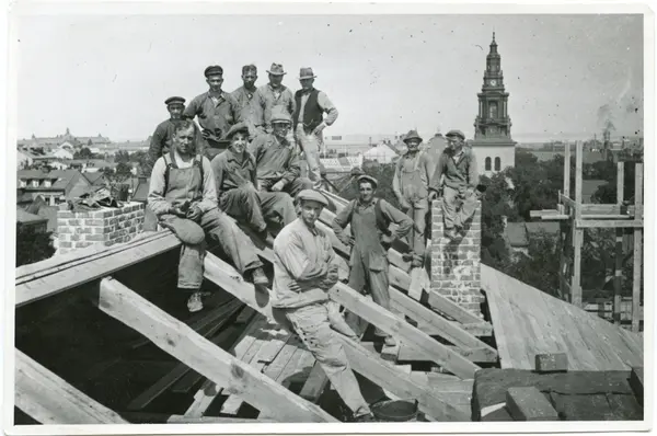 • Grupporträtt av arbetarna vid bygget av Tempo-huset, 1935.