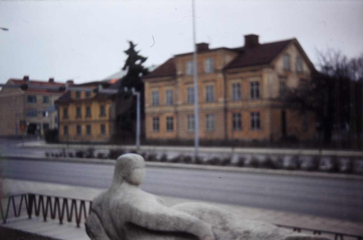 Bildtext: Elverket Hamngatan.  I förgrunden Skulpturen Strömmen av Stig Blomberg i vit Ekebergsmarmor, inköpt av f.d. Linköpings Elverk 1953.Visa helaStig Blomberg, som är född i Linköping, framställer gärna motiv med barn och ungdom. Utmärkande är en frodig humor och fantasifullhet i formen. Strömmen - av folkhumorn kallad Tempen - föreställer en voluminös liggande kvinnofigur. Formen är upplöst och ski...