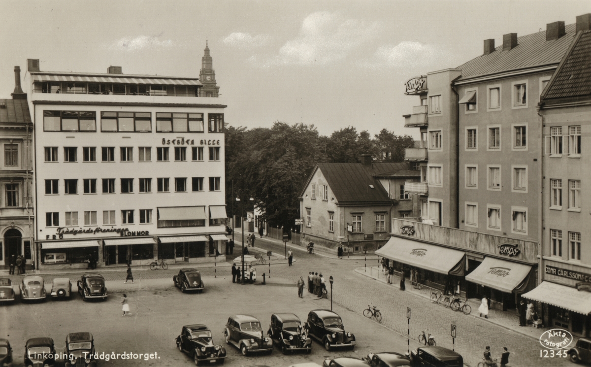 Bilparkering på Trädgårdstorget. Tempohuset som invigdes 1935 syns till höger i bild. Östgöta Gille och Trädgårdsföreningen Blommor finns i den stora ljusa byggnaden till vänster.