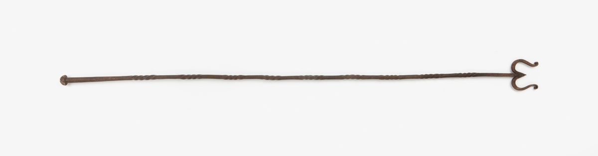 • Eldgaffel., smidd, treuddig, de yttre uddarna med upprullade spetsar. Skaftet omväxlande slätt och vridet, halvsvärisk knopp .