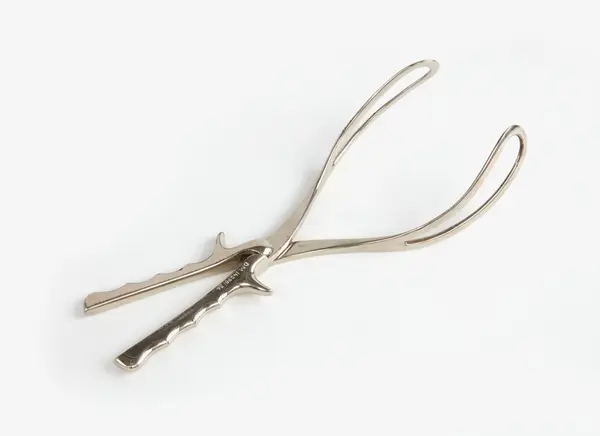 Förlossningstång av järn med ytskikt av vit metall. Fabrikstillverkad.