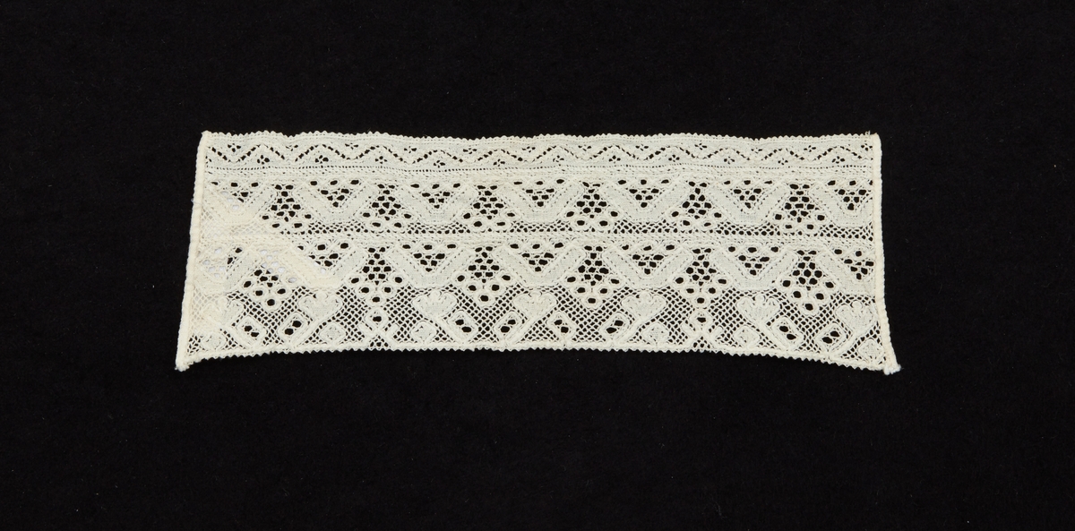 • Hattspets till Mockfjärds sockendräkt för kvinna. Två rader knypplad spets med en smal spets längs framkanten.