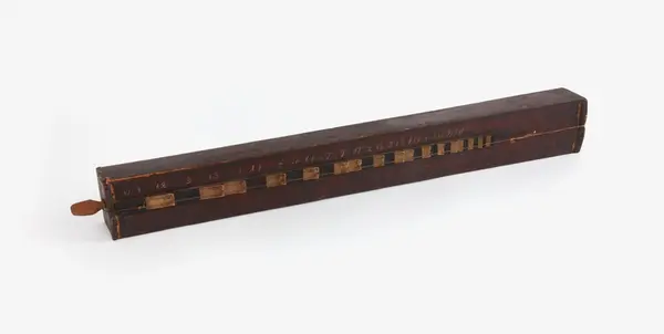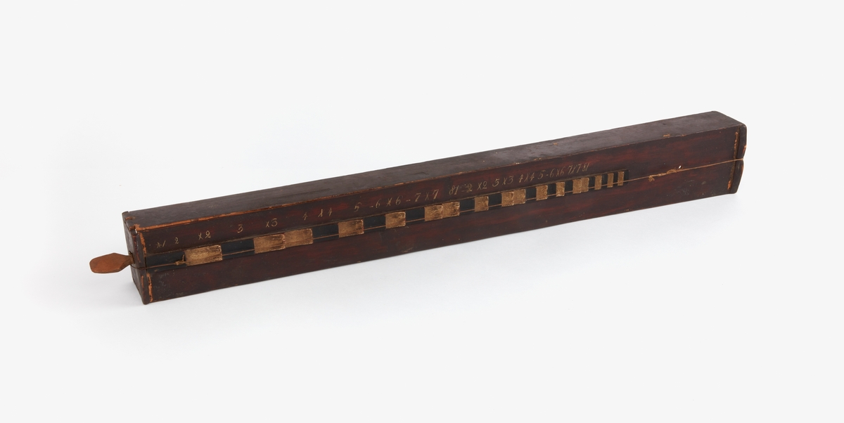 Psalmodikon. Lådan utvändigt målad med brun något laserande färg, greppbrädan målad med svart och vit oljefärg. Greppbrädans avsatser numrerade 'X1 2 3 3X 4 5 6X6 7X7 81 2X2 3X 3 4X4 5 6X6 7X7 81'. Skrivet med vit färg. Sensträng som gått av samt knutits ihop och i ena änden skarvats med ett snöre, stall saknas. Litet ljudhål. På lockets undersida är tecken ritade med krita. På sargens insida liten klisterlapp på vilken för hand är skriven 'No 243'. Kortsidan vid stämskruven har spruckit i tre delar. Instrumentets samtliga fogar har varit limmade, men limmet har krackerat och fogarna har släppt.