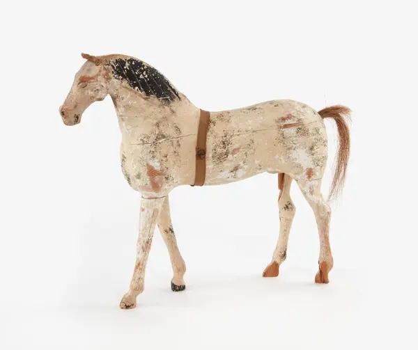 Enligt äldre beskrivning: Häst. Svans av tagel och äron av läder. Målad grå och svart på vit grund. Färgen flagar.