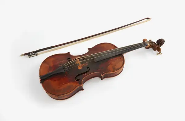 • Fiol med stråke. Har tillhört spelmannen Hins Anders, Mora. Fiolen är sliten, nästan all lackering avnött. Tydligt avtryck vid platsen för hakan. Svart greppbräda med vitt band vid snäckan. Fyra stämskruvar. Stråke med pärlemorinläggningar, blomstermönster.