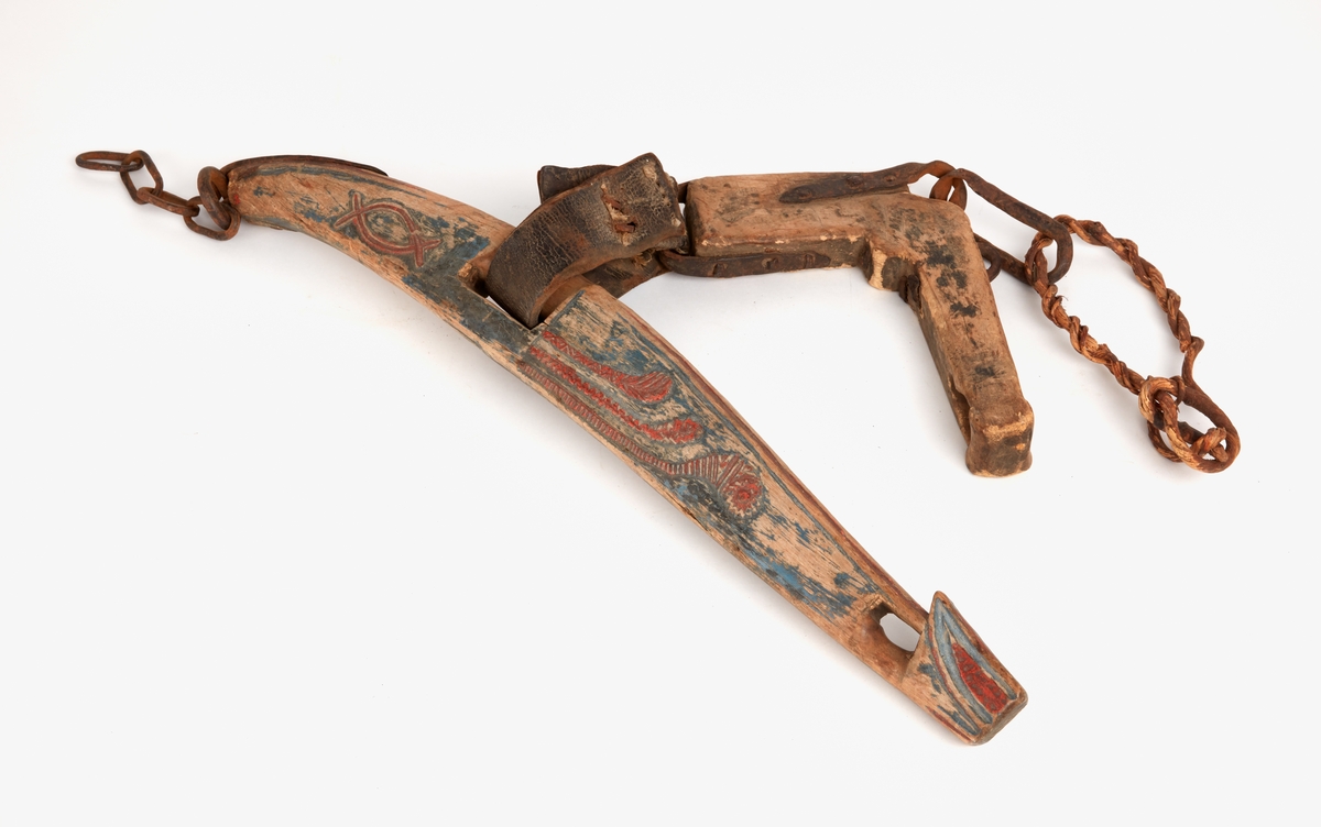 • Ett bogträ och selknä. Skuren och bemålad dekor. Beslag och kedja av järn. Fäste av dubbelt läder. Bindrem av tvinnad rot.
