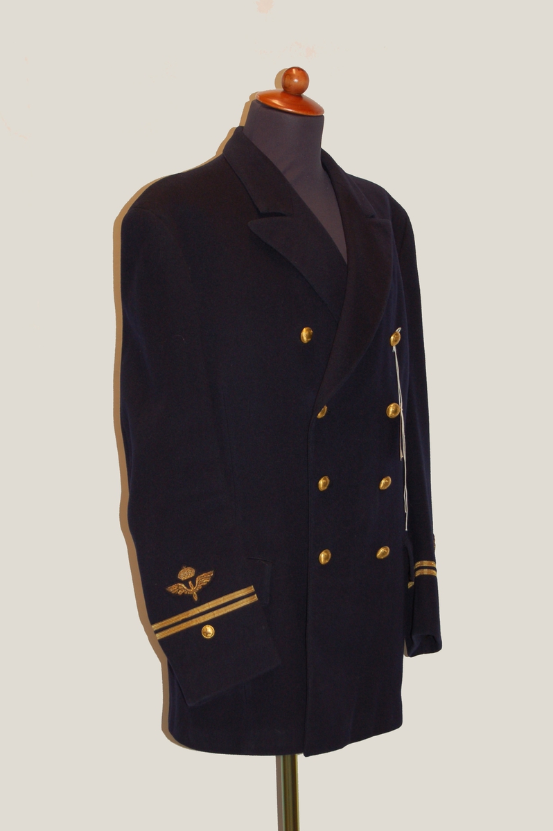 Kavaj m/30 med gradbeteckning fanjunkare. Kavajen är av mörkblått ylletyg. Kragen har två slag och kavajen knäpps med två knapprader om fem knappar vardera. Kavajen har rakskurna ficklock och insydda fickor. Ärmarna har 70mm flygemblem, gradbeteckning fanjunkare samt stjärnkapp m/45.
