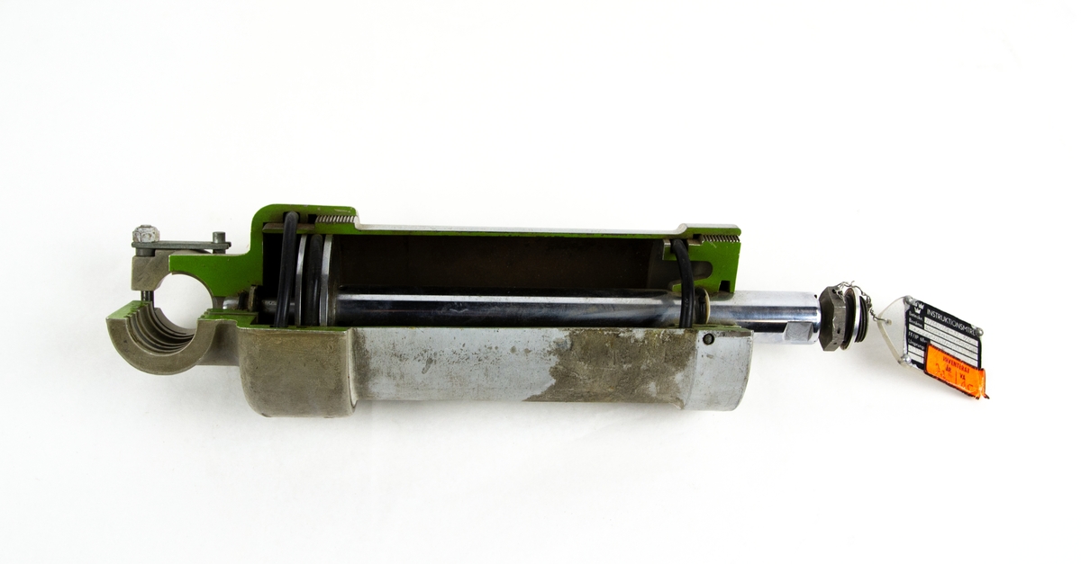 • Manövercylinder till huvudställ i flygplan 32. Cylindrisk i formen uppskuren för undervisning, uppskärning grönmålad.