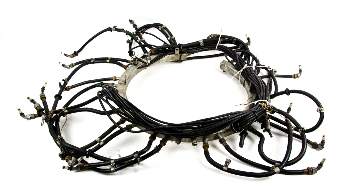Tändkabelsamlare till motor STWC3. Rund form i metall med utstickande kablage, svart och metallfärgad.