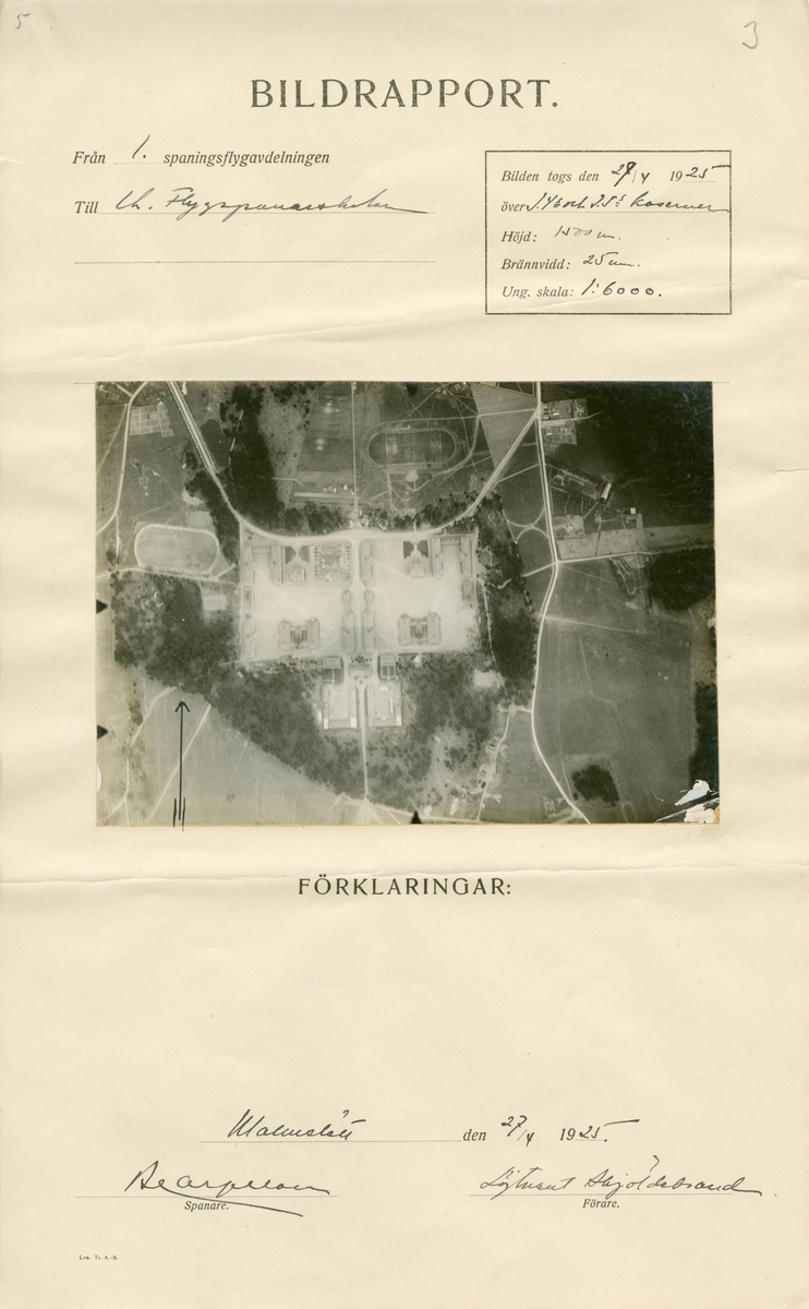 • Bildrapport från flygspanarskolan på Malmen, 29/4 1925. Rapportblad om spaning med påklistrat flygfotografi.