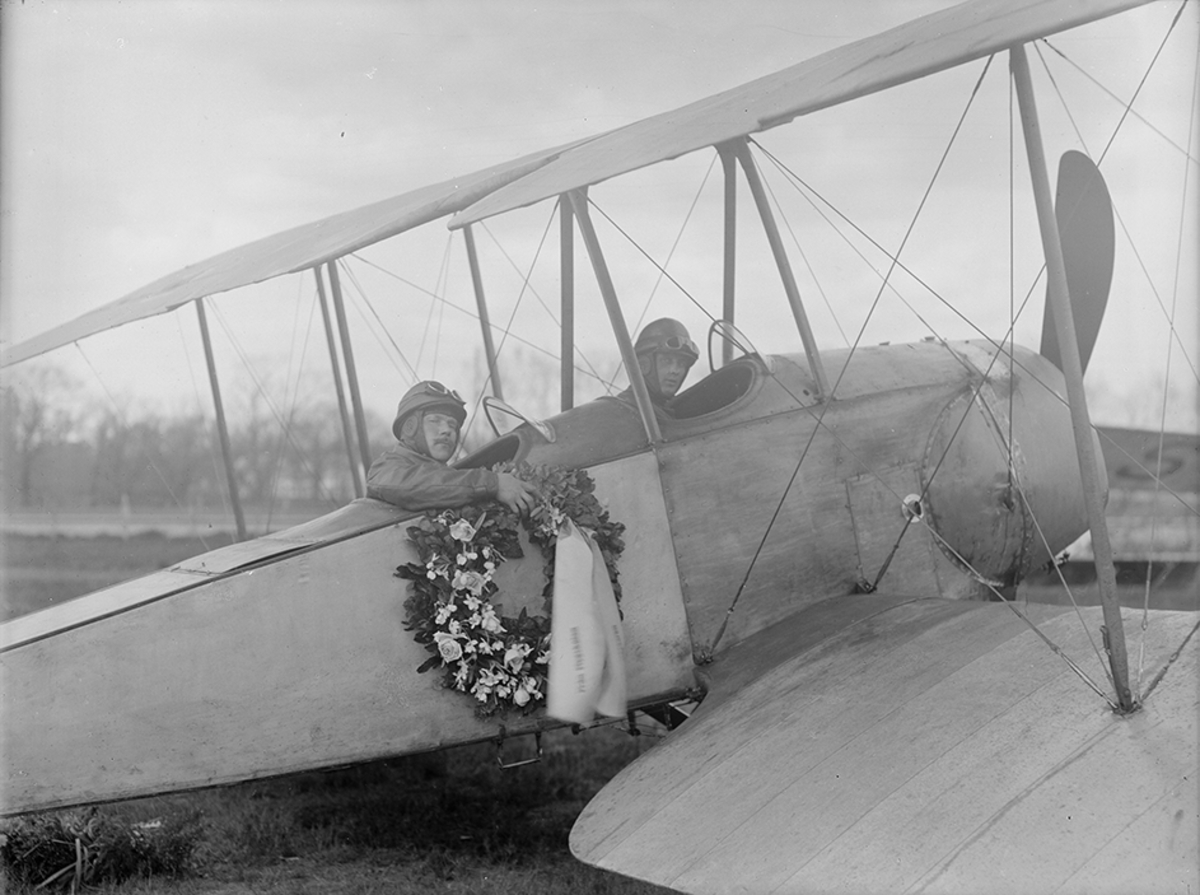 Två flygare med begravningskrans sitter i flygplan Thulin E.