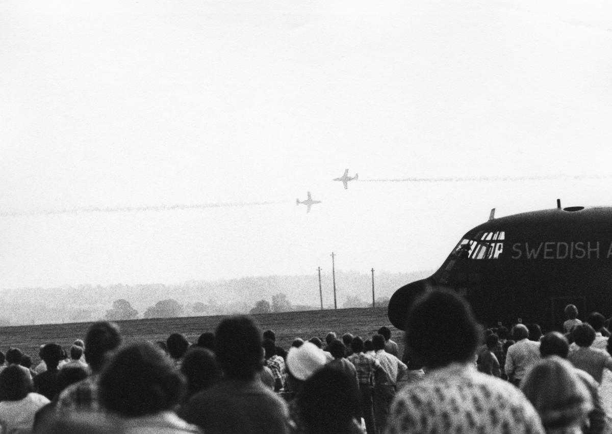 • Avancerad flygning med två flygplan SK 60 ur Flygvapnets uppvisningsgrupp vid flygdagen på Malmen den 28 augusti 1976. Vid firande av Flygvapnet 50 år. Flygplanen syns på långt håll. I förgrunden syns publik samt del av flygplan TP Hercules.