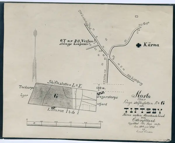 Karta över skifteslotten L o E (Tockarps ägor). Skifteslotten uti Tiftsby i Kärna socken Hanekinds härad och Östergötland.Upprättad för haga skifte åren 1844 och 1855 af Ernst Wiman.