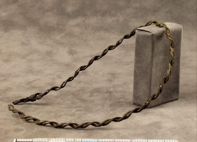 Två mycket tunna bronstenar snodda om varandra från grav 2/57 skelettgrav c , 1957 undersöktes vid puser i fröjel ett större röse, daterat till bronsålder, kallat grav 2/57, samt två mindre gravrösen...