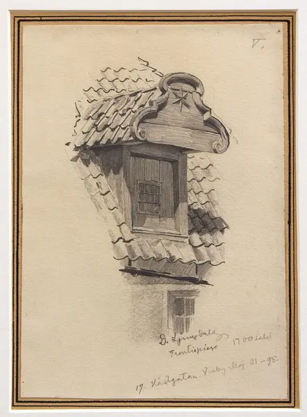 • Del av ett hus där ett fönster har utsmyckad överskjutande gavel, "frontespis". Numrering i övre h. hörn: V. Text: D. Ljungdahl Frontispiece 1700-talet 17. Hästgatan. Visby Maj 31 -95