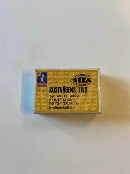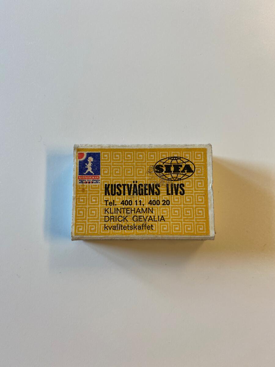 • Gul meandermönstrad tändsticksask från Kustvägens Livs i Klintehamn.