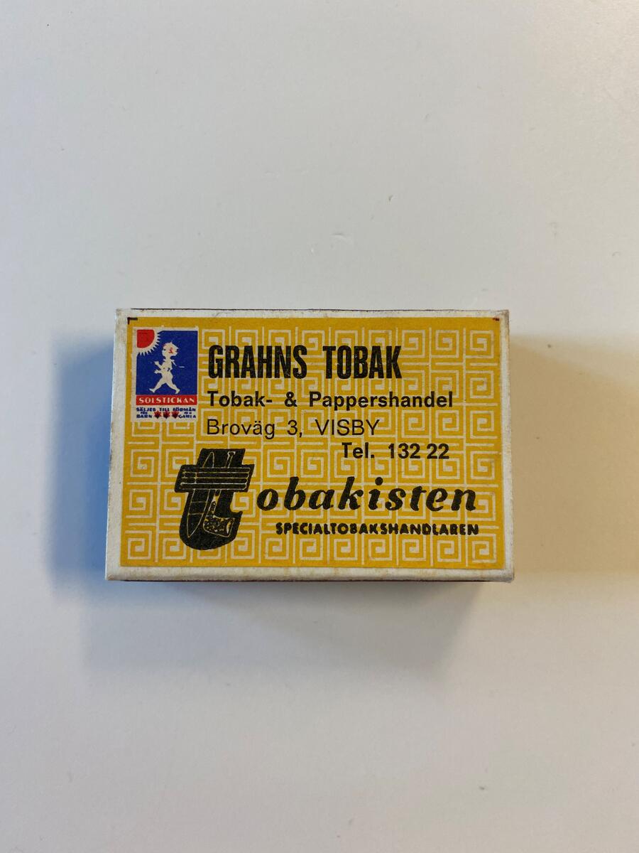 • Gul meandermönstrad tändsticksask från Grahns Tobak i Visby.