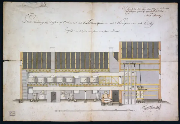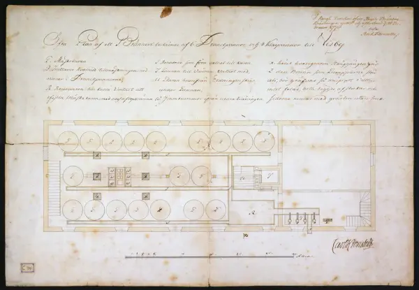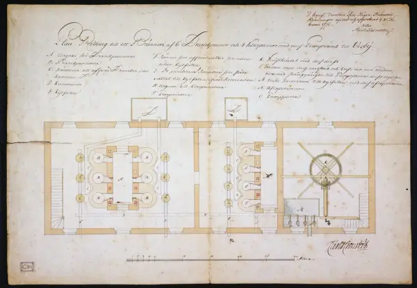 Fyra stycken ritningar över Kronobränneriet i Visby, numera Gotlands Fornsal. Genomskärning på längden och bredden samt två planritningar (nedre och övre plan). "I KONGL. DIRECTION ÖFVER DEN REGALE BRÄNNVINSBRÄNNINGEN, UPPVIST OCH APPROBERAD DEN 26 FEBRUARI 1776". 4 ST. TILL KRONOBRÄNNERIET I VISBY /NUMERA GOTLANDS FORNSAL/, " I KONGL. DIRECTION ÖFVER DEN REGALE BRÄNNVINSBRÄNNINGEN, UPPVIST OCH AP...