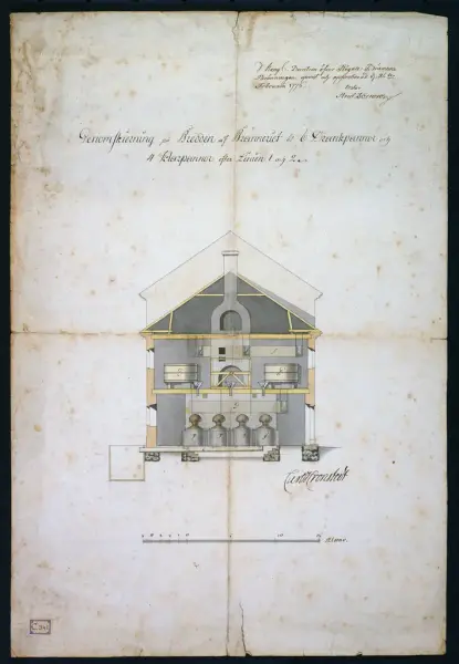 Fyra stycken ritningar över Kronobränneriet i Visby, numera Gotlands Fornsal. Genomskärning på längden och bredden samt två planritningar (nedre och övre plan). "I KONGL. DIRECTION ÖFVER DEN REGALE BRÄNNVINSBRÄNNINGEN, UPPVIST OCH APPROBERAD DEN 26 FEBRUARI 1776". 4 ST. TILL KRONOBRÄNNERIET I VISBY /NUMERA GOTLANDS FORNSAL/, " I KONGL. DIRECTION ÖFVER DEN REGALE BRÄNNVINSBRÄNNINGEN, UPPVIST OCH APPROBERAD DEN 26 FEBRUARI 1776 ".