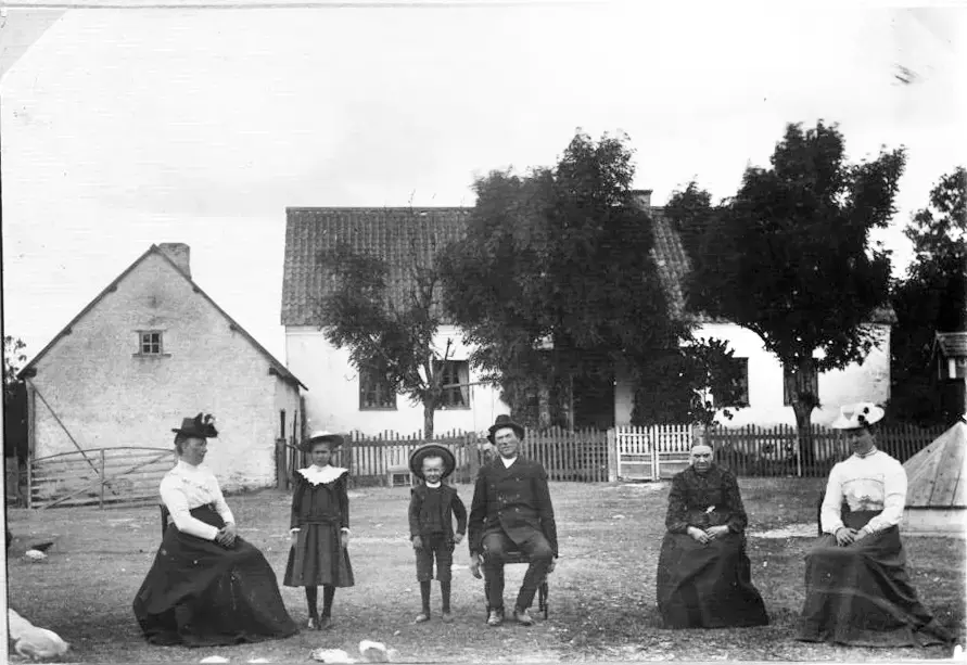 På bilden ser vi familjen Karlsson posera i finkläder framför manbyggnaden. Från vänster ser vi: Lovisa Maria Johansdotter 45 år, dottern Gerda Sigrid Lovisa nästan 8 år, sonen Nils Ragnar Leonard nästan 5 år, maken Karl Karlsson 50 år, modern Anna Lovisa Larsdotter 69 år och okänd kvinna, hon kan möjligen vara Karls brorsdotter Rosa Johanna Maria Karlsson 17 år. Det var Anna Lovisa och hennes man Johan som uppförde manbyggnaden i bakgrunden 1874, ett likadant hus som byggdes på Karls föräldragård Kauparve året före.