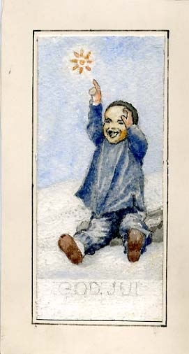 • Tre barn i vinterlandskap blickar upp mot månen. I nederkant texten: "GOD JUL TILLÖNSKAS AV Ellen och Aron".