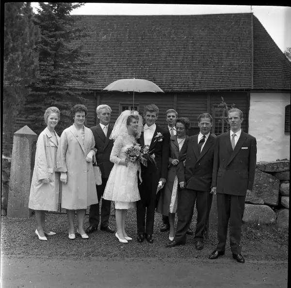• Ett bröllopssällskap står uppställda för fotografering. I mitten står bruden och brudgummen. I bakgrunden syns en kyrka med spånfasad.