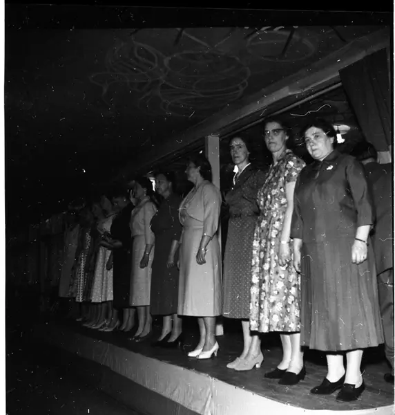 - Tio kvinnor i klänningar står uppställda på en scen.