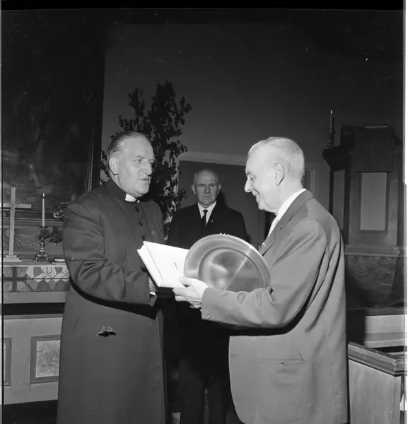 Prosten Wallis Wendel står vid altaret i Örserums kyrka och har just överlämnat ett tennfat och en bok till köpman John Ingesson i samband med kyrkans 30-årsjubileum.