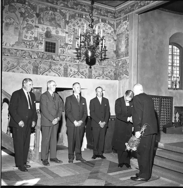 - Rudolf Boman med blomsterbukett i handen handhälsar på kyrkoherden i Vireda kyrka. Bakom dem står fyra okända män på rad.
