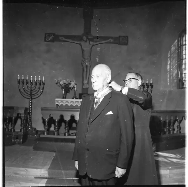 - Rudolf Boman står i Vireda kyrka och erhåller Patriotiska sällskapets guldmedalj runt halsen av kyrkoherden.
