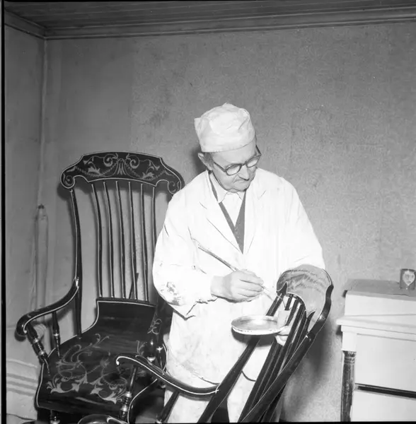 - Målare Erik Karlsson i Hullaryd, 70 år, mars 1964. I målarkläder med liten fin pensel i handen. Dekorationsmålar på gungstol.