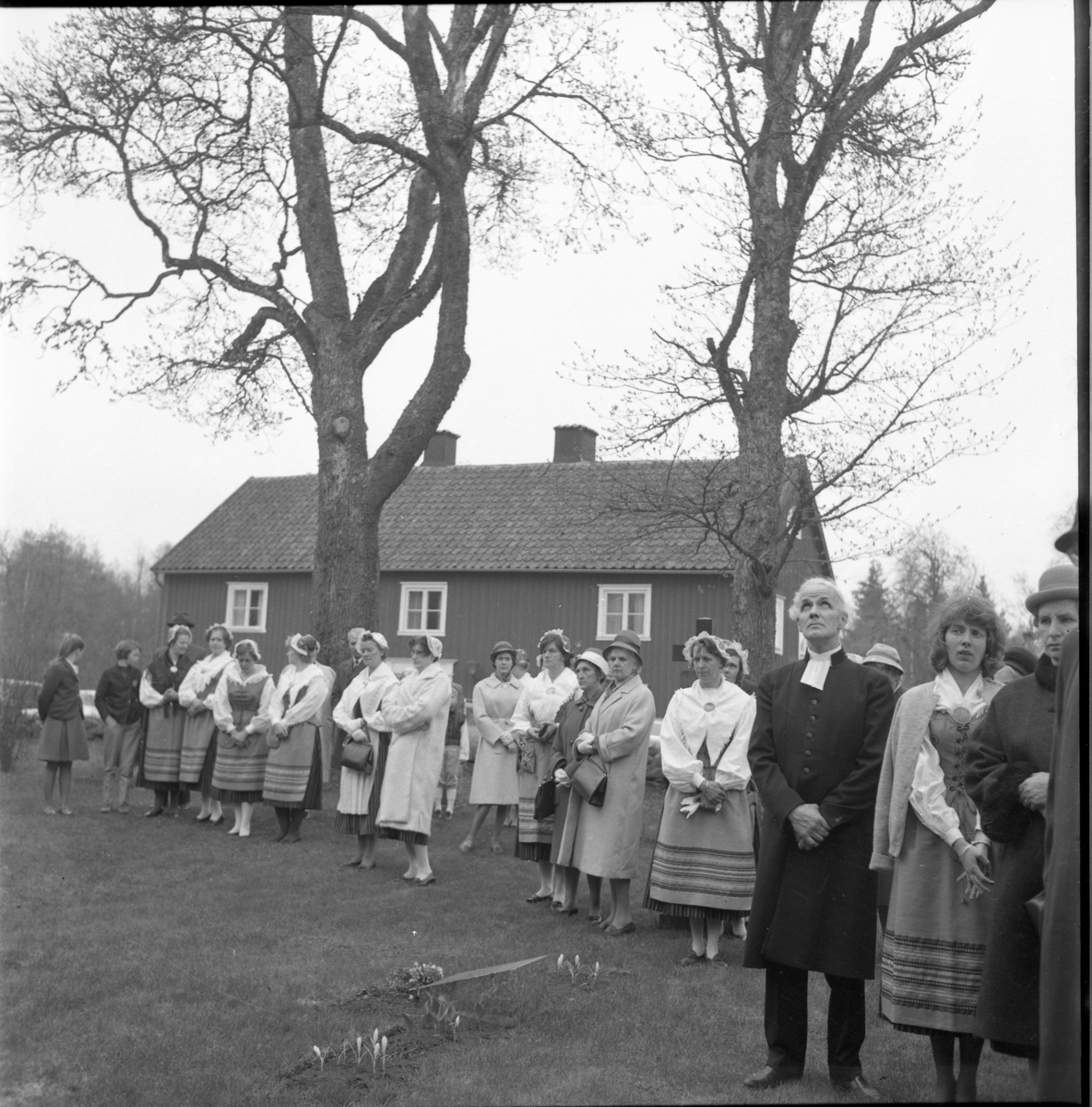 "Kyrkfärd till Vireda" med okänd grupp, flertalet i folkdräkt, utanför Vireda kyrka (sannolikt). Som, nr 15 fr v står Elna Wallmo Andersson folkdräkt, därnäst i vardaglig klädsel Gullan Landström. Till vänster om prästen Thore Lord kikar Kerstin Ekman fram