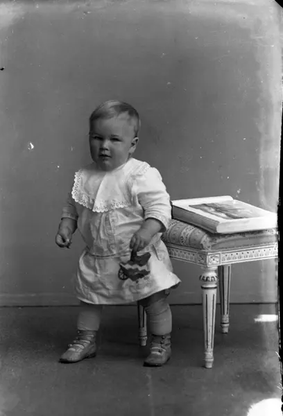 - Porträtt av ett spädbarn - en liten pojk - som står mot en pall av gustaviansk stil.