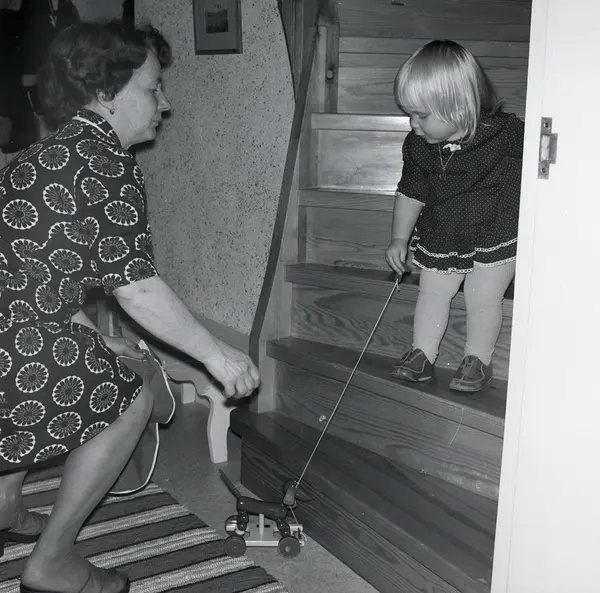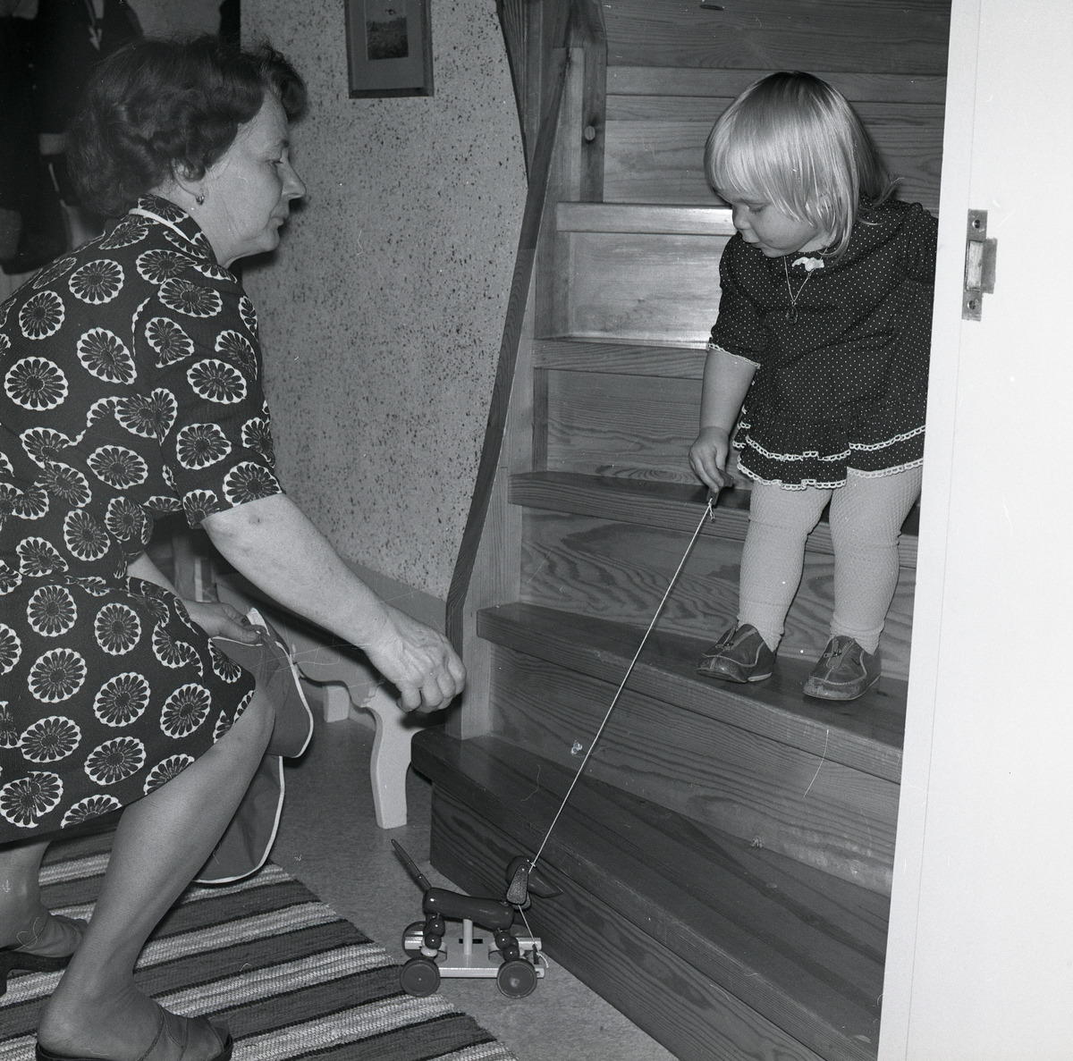 Adéle Mickelsson hjälper sitt barnbarn med en leksakshund, julafton 1974.