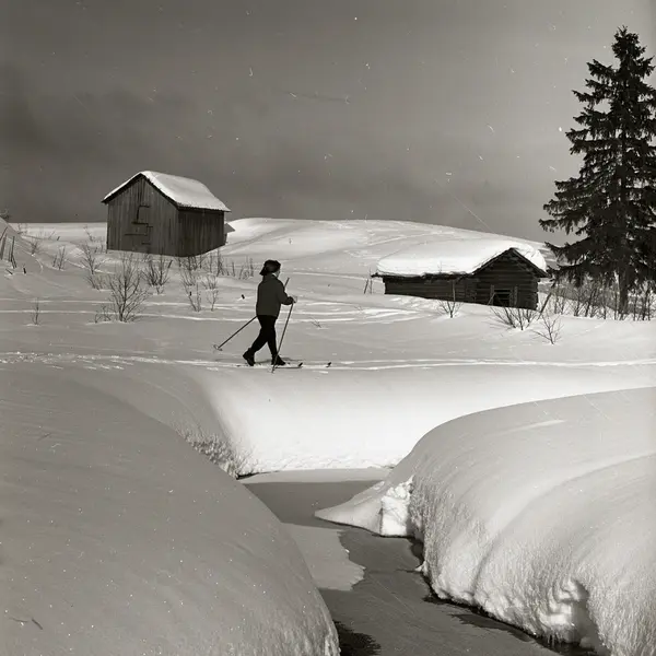 • Adéle Mickelsson åker skidor förbi några lador vid ån, vårvintern 1966.