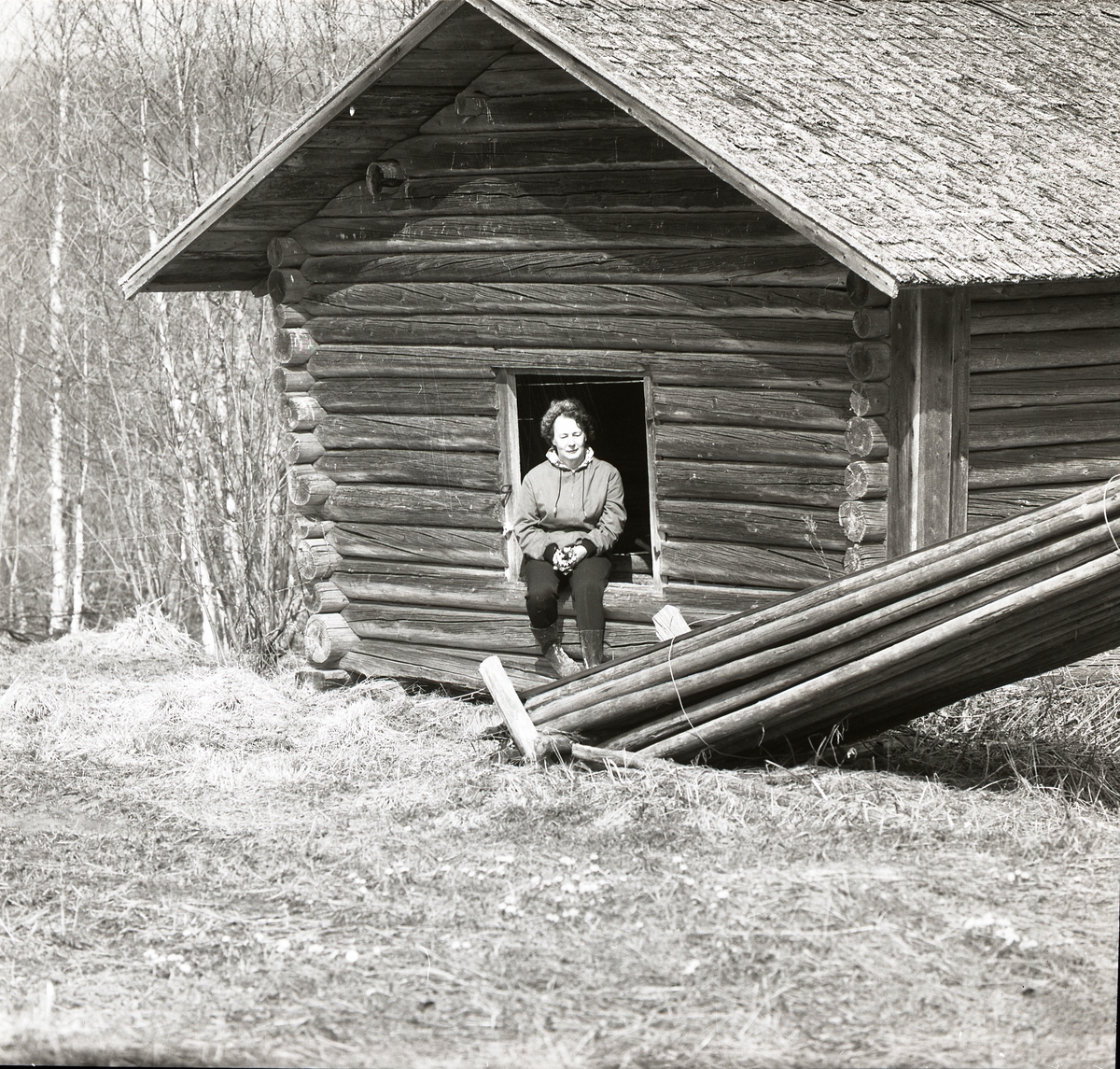 • Adéle Mickelsson sitter i solen vid gamla åladan i Utegården, våren 1969.