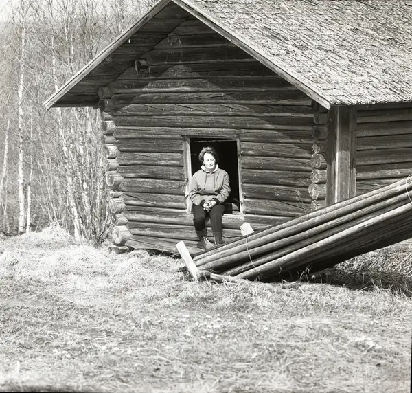 Adéle Mickelsson sitter i solen vid gamla åladan i Utegården, våren 1969.