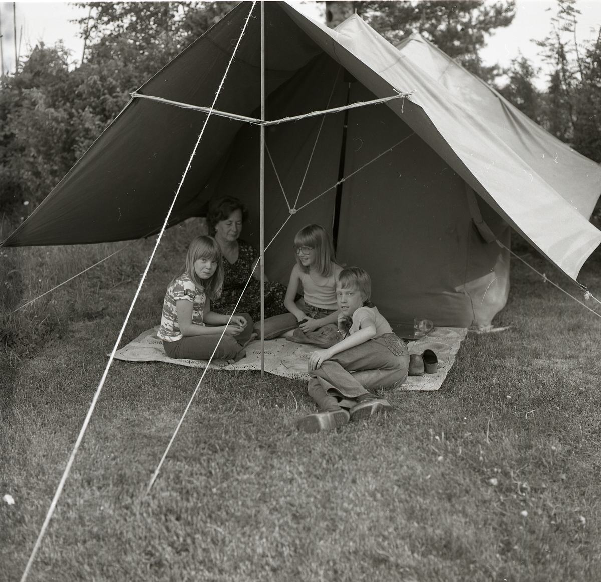 • Adéle Mickelsson sitter med några barn utanför öppningen till ett tält, midsommar 1978.