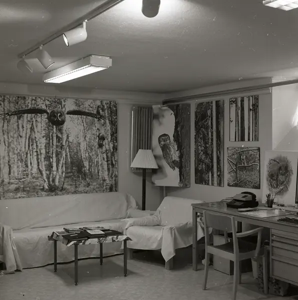 • Ett rum med soffa och bord samt tavlor med Hilding Mickelssons fotografier av fåglar.