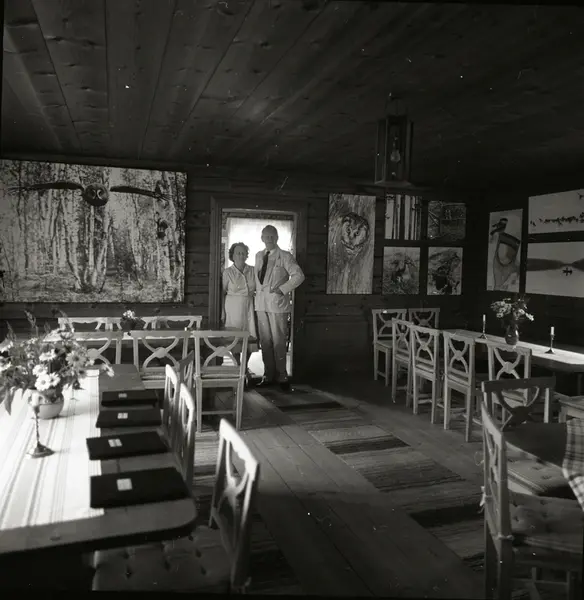 En man och en kvinna står i en dörrpost till ett rum där väggarna är besatta med Hilding Mickelssons bilder.