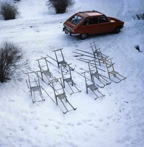 "Norrländskt symöte", Rengsjö. En personbil och en samling sparkar står parkerade i snön.