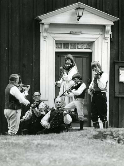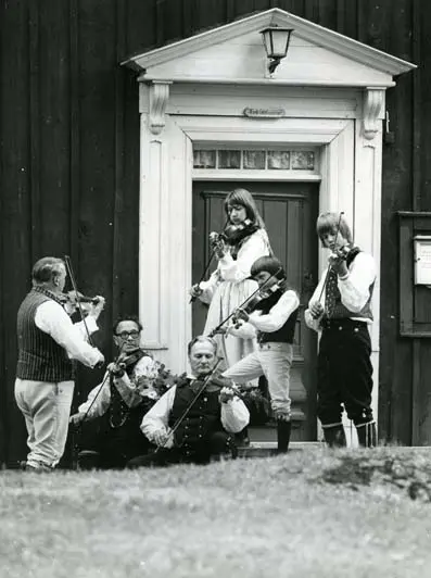 • Arbråspelmän med fioler vid forngården i Arbrå.