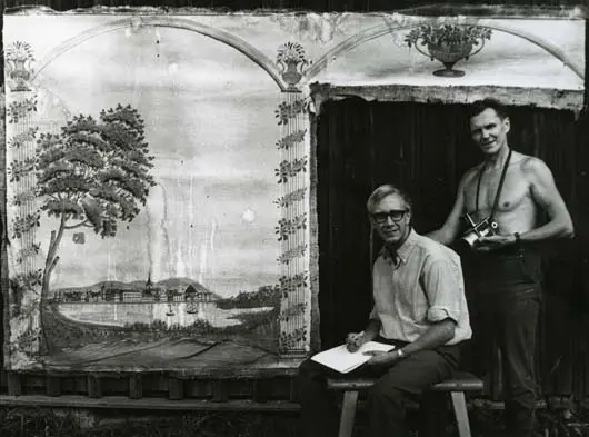 Hilding Mickelsson och antikvarie Ingemar Svensson vid väggmålning.