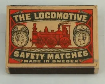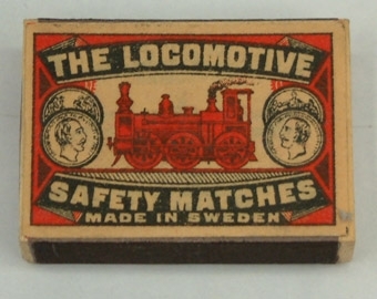 • Tändsticksask med röd botten med banderoller överst och nederst med texten på.
