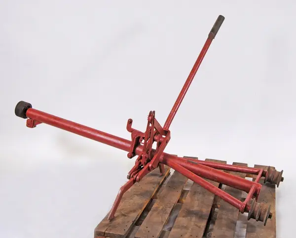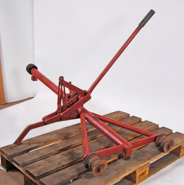 • Slipersax med hävstång samt i ena änden två hjul och i andra änden ett hjul. Redskapet har varit ihopfällbart men har blivit ihopsvetsat så att det inte går att fälla längre. Slipersaxen är rödmålad. ... Visa hela