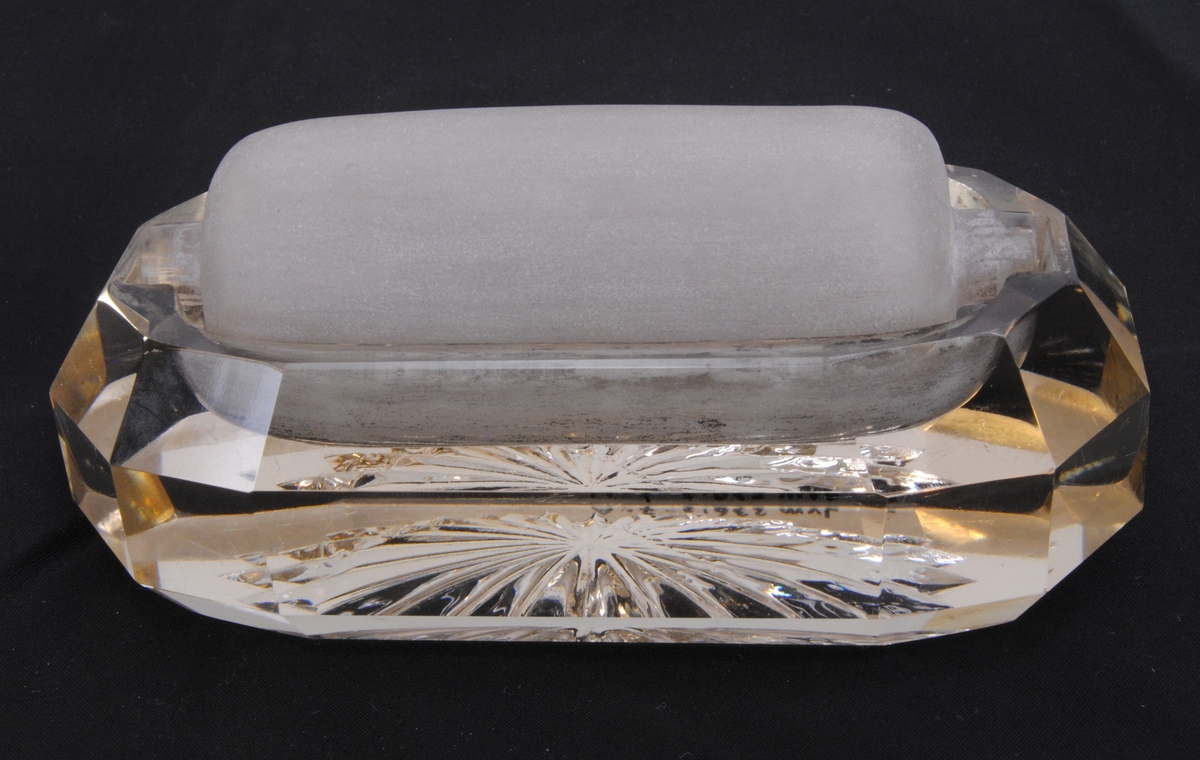 En frimärks-och etikettfuktare av glas i två delar bestående av skål samt rulle. Rektangelformad skål med fasettslipat glas. Nedsänkningar i vardera ände av skålen med plats för fuktrulle. Botten med stjärnslipning. Ihålig rulle av frostat glas i form av vals. Glasets färg har en ton av gul.